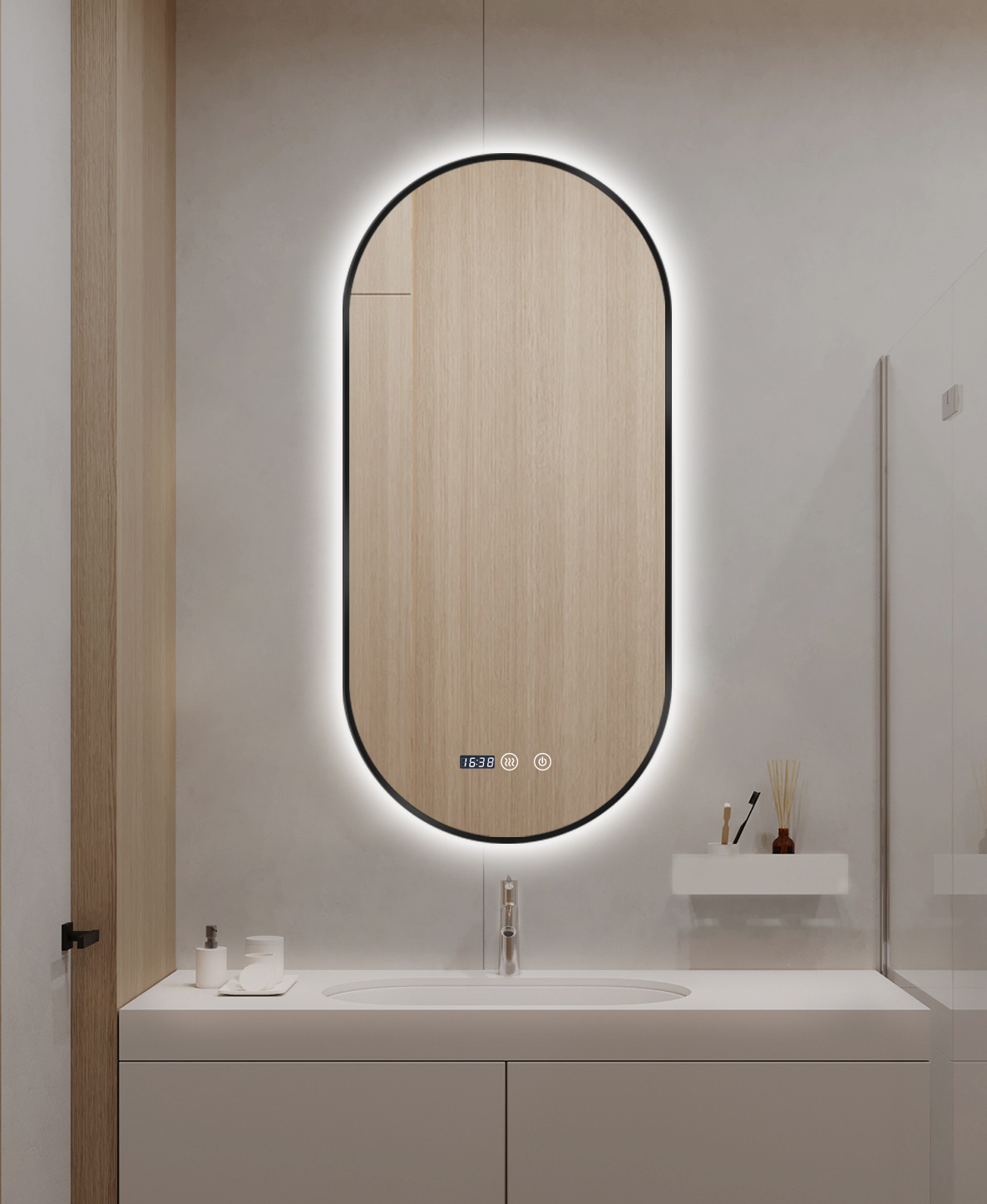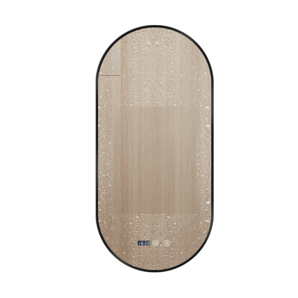 Oglinda LED 50x100cm Rama Neagra, 3 Lumini, Ceas, Dezaburire si Touch LLJ180