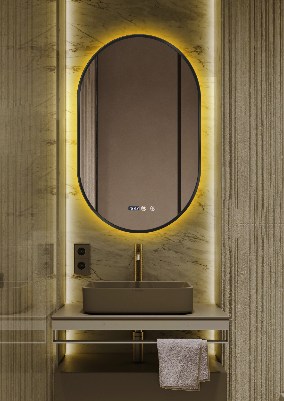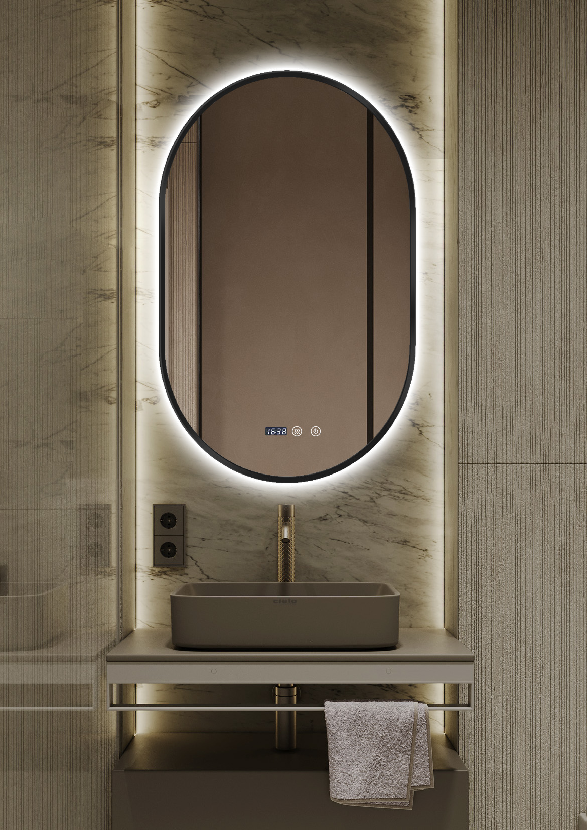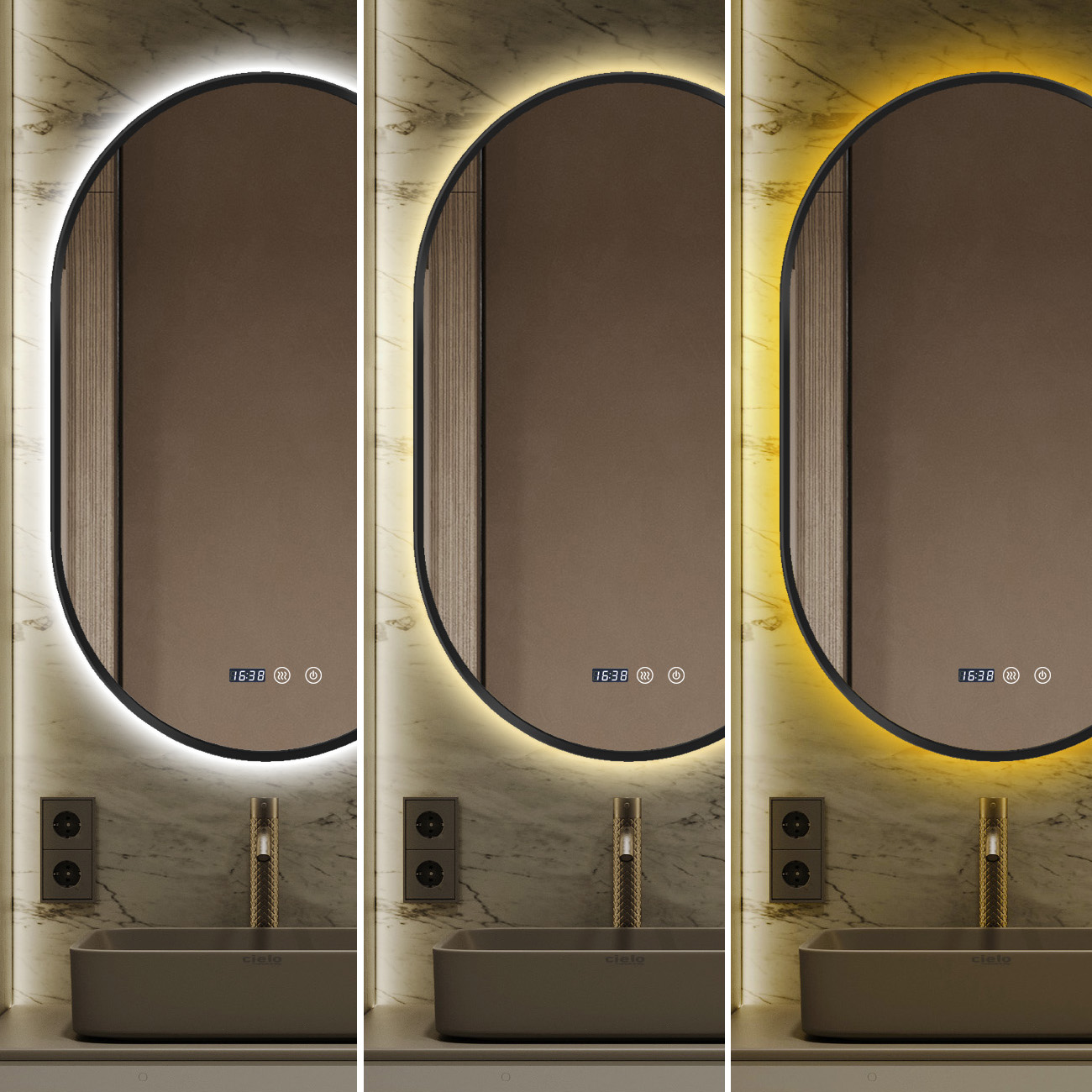 Oglinda LED 50x80cm Rama Neagra, 3 Lumini, Ceas, Dezaburire si Touch LLJ180